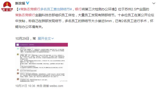 連日來,“常熟農商銀行上百名員工被曝體檢查出肺結節”的消息一直牽動著大家的心。據悉2019年5月以來,員工陸續搬入新辦公樓,“剛搬入時,就有員工提出辦公室有較強裝修異味。而且自員工搬入后,銀行在工作日進行多輪二次裝修,裝修材質氣味非常濃烈刺鼻。”常熟農商行發布的《說明》中顯示兩次環境檢測報告均為合格,但因檢測污染物項目不全、期間進行二次裝修等原因而引起質疑。